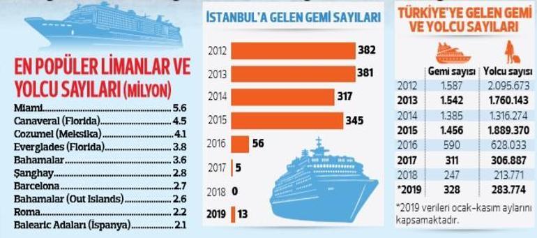 2012’de 2 milyondan fazla turist gemi ile Türkiye’ye gelirken, 2019’un ilk 11 ayında gelen yolcu sayısı 283 bin oldu. İstanbul’a gelen yolcu sayısı ise 2013’te 689 bine çıkmış, 2018’de sıfırlanmıştı. 2019’da ocak-kasım döneminde ise 7 bin 513 oldu. Türkiye’ye gelen gemi ve yolcu sayısının bu kadar düşmesinde 2016 ve sonrasında yaşanan kötü olayların etkisi oldu. İstanbul’da kaybın bu denli büyük olmasının başka bir sebebi daha vardı. O da Karaköy’deki limanın kapanması ve yenilenmesi süreciydi. Ancak Karaköy’deki yenilenme süreci sona ermek üzere ve Galataport ilk gemisini nisan ayında ağırlayacak. 2020’de şu an için 64 gemi Galataport’a geleceğini açıklasa da asıl patlamanın 2021 ve 2022’de olması bekleniyor.