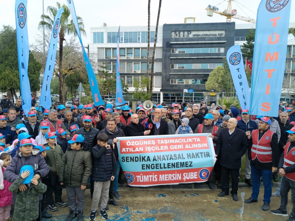 Mersin Uluslararası Liman İşletmeciliği (MIP) bünyesinde faaliyet gösteren Özgüneş Taşımacılık’ta çalışan 180 işçi, Tüm Taşıma İşçileri Sendikası’na (TÜMTİS) üye olduktan sonra işten çıkarıldı. Sendikal haklarının tanınmasını ve işlerine geri dönmeyi talep eden işçiler, eylemlerini sürdürüyor.