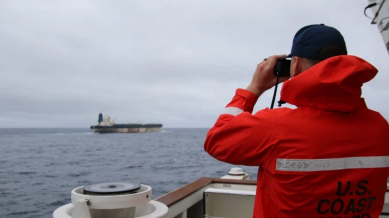 Petrol tankeri geminin Sahil Güvenlik Komutanlığı gemisinden takip edilişi görülüyor. Bir kırmızı üniformalı asker elinde dürbünle ilerideki gemiyi takip ediyor.Kaynak,ABD Avrupa Komutanlığı